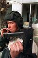 A Chechen fighter holds up his homemade Borz submachine gun during the battle for Grozny, January 1995