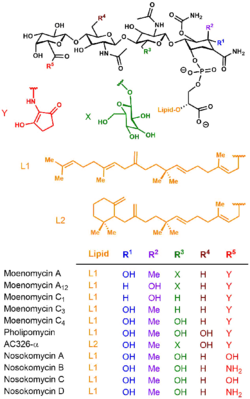 It is the combination of different isoprenoid chains and variously substituted tetrasaccharides that give rise to the diversity of the moenomycin family.[3]