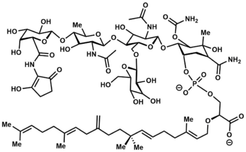 The moenomycins target bacterial peptidoglycan glycosyltransferases, inhibiting cell wall formation, leading to cell death.[13] In general, the antibiotics are particularly potent against gram-positive bacteria with a minimum inhibitory concentration (MIC) between 1–100 (ng/ml). At higher concentrations the moenomycins are also effective against gram-negative bacteria with an MIC between 0.3–150 (μg/ml). In vivo studies using mice models suggest the antibiotics are powerful prophylactic and therapeutic agents, with subcutaneous injection being the most effective mode of delivery.[14]