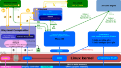 nouveau is a Gallium3D-style device driver and works on top of the Direct Rendering Infrastructure (DRI). It is composed of the two Kernel-components DRM & KMS driver, and the user-space components libDRM, and Mesa 3D.