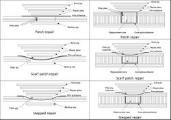 Some repairs need the specialist equipment of the workshop and some form of improvised repair is needed to return the component to a suitable repair workshop. A temporary repair, usually in the form of a patch, can be fixed to the component to ensure safety until the component can be repaired at a later date. For a permanent repair all the approved general guidelines for laminate and sandwich repairs should be followed. These repair operations should be carried out in controlled workshop areas to ensure high quality. Operating in a controlled environment and attention to the detail will ensure success.