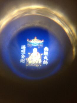 It is common to find prayer beads in Japan that contain a small image inside the largest bead, usually something associated with the particular temple or sect. When held up to the light the image is clearly visible.