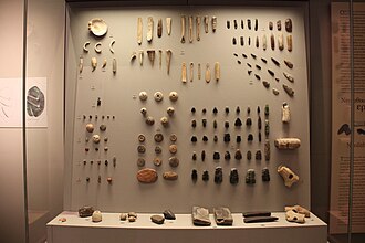 Mary Leakey (1971) reported 125 modified bones and teeth from Olduvai Beds I and II. These bone tools were interpreted to have been modified by intentional flaking.[6] According to Shipman (1984) the Olduvai bone tools collection can be described as consisting of anvils and tools for heavy duty activities such as butchering or digging.[7] The purported bone tool assemblage consists of fresh bone shaft fragments and epiphyseal pieces from large and very large mammals and bearing five or more flake scars.[1] These flaked bone tools are correctly interpreted as used and modified by hominins.
