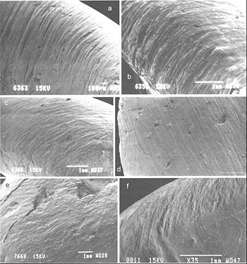 In addition, metric analysis on the Swartkrans assemblage demonstrates that longer, wider and more robust bone fragments were selected by hominins for bone tool manufacture.[1] This supports the taphonomic analysis in distinguishing bone tools and pseudo-tools.[1] Scanning electron microscope analysis further suggests that the wear pattern and distribution on the Swartkrans bone tools evidence traces of grinding on used bone tools of the Swartkrans assemblage.[1] Grinding, a technique particular to the bone tool, suggests that hominins used intentional shaping for the production of the bone tool.[1] This suggests that hominins had the cognitive ability to modify a bone implement with the intention of improving it.[1]