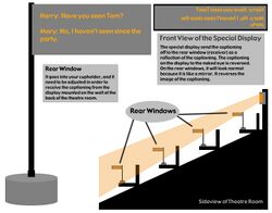 On the way into the theatre, viewers pick up a reflective plastic panel mounted on a flexible stalk. The panel sits in a seat cupholder or on the floor adjacent to the seat. A large LED display is mounted on a rear wall that displays caption characters in mirror image. Viewers move the panels into position (usually below the movie screen) so they can read the reflected captions and watch the movie. It is sometimes necessary to sit in a certain area of the theater to obtain the best angle for reflecting the backward text emitted from the back of the theater on the panel while also being able to view the movie at the same time.
