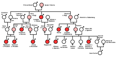 Haemophilia has featured prominently in European royalty and thus is sometimes known as 'the royal disease'. Queen Victoria passed the mutation for haemophilia B[50][51] to her son Leopold and, through two of her daughters, Alice and Beatrice, to various royals across the continent, including the royal families of Spain, Germany, and Russia. In Russia, Tsarevich Alexei, the son and heir of Tsar Nicholas II, famously suffered from haemophilia, which he had inherited from his mother, Empress Alexandra, one of Queen Victoria's granddaughters. The haemophilia of Alexei would result in the rise to prominence of the Russian mystic Grigori Rasputin, at the imperial court.
