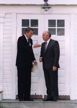 Both Gorbachev and Reagan wanted a summit to discuss the Cold War, but each faced some opposition to such a move within their respective governments.[135] They agreed to hold a summit in Geneva, Switzerland, in November 1985.({{{1}}}, {{{2}}}) In the buildup to this, Gorbachev sought to improve relations with the US's NATO allies, visiting France in October 1985 to meet with President François Mitterrand.({{{1}}}, {{{2}}}) At the Geneva summit, discussions between Gorbachev and Reagan were sometimes heated, and Gorbachev was initially frustrated that his US counterpart "does not seem to hear what I am trying to say".[136] As well as discussing the Cold War proxy conflicts in Afghanistan and Nicaragua and human rights issues, the pair discussed the US's Strategic Defense Initiative (SDI), to which Gorbachev was strongly opposed.[137] The duo's wives also met and spent time together at the summit.[138] The summit ended with a joint commitment to avoiding nuclear war and to meet for two further summits: in Washington, DC, in 1986 and in Moscow in 1987.[137] Following the conference, Gorbachev traveled to Prague to inform other Warsaw Pact leaders of developments.[139]