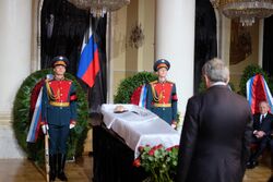 A funeral for Gorbachev was held on 3 September 2022 from 10 a.m. to 12 noon in the Column Hall of the House of Unions. The ceremony included an honor guard, but was not an official state funeral.[418] The service included rites administered by a Russian Orthodox priest.[419][420] Russian president Vladimir Putin bid an official farewell to Gorbachev on 1 September 2022 during a visit to the Central Clinical Hospital, where he laid flowers at his coffin.[421][422] His press secretary Dmitry Peskov said that the "tight schedule of the president" would not allow him to be present at the funeral, as he was scheduled to visit Kaliningrad.[421][423] Gorbachev was buried on the same day at Moscow's Novodevichy Cemetery, in the same grave as his wife Raisa, as requested by his will.[249]