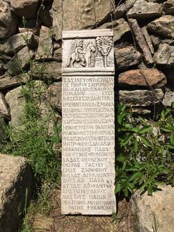 The Tablet A is the larger and older inscription, dated to 175-211 AD, and which originates from the time when king Tiberius Julius Sauromates II (175-211 AD) ruled the Bosporan Kingdom.[18] The marble tablet (0.92 x 0.73 x 0.09) probably sustained heavy damage even before the excavation.[18] Thirty-two lines from thirty fragments were saved from the inscription.[19] The public inscription mentions the king, the synod, or devotional assembly, the leadership of the devotional assembly, and its regular members, which were slightly less than forty.[19] The fourth line ends by mentioning of the father of the devotional assembly, Horoúathos (Χορούαθος), who is referred to by name in the fifth line,[19] and amongst others an unknown male who is said to be the son of Horoáthos (Χοροάθου) is also cited.[20] The inscription ends with the date, from which is saved only the appellation of the Greek-Macedonian month, which corresponds to either July or August.[20]