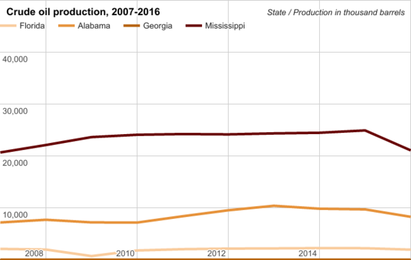 The graph and table below provide information about crude oil production in Florida. Information from select surrounding states is provided for comparative purposes. Click the [Show] button on the table to expand it.[16]