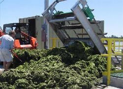 The Algae scrubber is a system designed primarily for cleaning nutrients and pollutants out of water using algal turfs. An algal turf scrubber (ATS) mimics the algal turfs of a natural coral reef by taking in nutrient rich water from waste streams or natural water sources, and pulsing it over a sloped surface.[89] This surface is coated with a rough plastic membrane or a screen, which allows naturally occurring algal spores to settle and colonize the surface. Once the algae has been established, it can be harvested every 5–15 days,[90] and can produce 18 metric tons of algal biomass per hectare per year.[91] In contrast to other methods, which focus primarily on a single high yielding species of algae, this method focuses on naturally occurring polycultures of algae. As such, the lipid content of the algae in an ATS system is usually lower, which makes it more suitable for a fermented fuel product, such as ethanol, methane, or butanol.[91] Conversely, the harvested algae could be treated with a hydrothermal liquefaction process, which would make possible biodiesel, gasoline, and jet fuel production.[92]