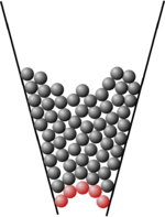 The simplest realization of a static jammed system is a random sphere packing of frictionless soft spheres that are jammed together upon applying an external hydrostatic pressure to the packing. Right at the jamming transition, the applied pressure is zero and the shear modulus is also zero, which coincides with the loss of rigidity and the unjamming of the system. Also, at the jamming point the system is isostatic. Above the jamming point, the applied pressure causes an increase of volume fraction by squeezing the soft spheres closer together, and thus creates additional contacts between neighboring spheres. This leads to an increase of the average number of contacts [math]\displaystyle{ z }[/math]. As shown in numerical simulations by Corey O'Hern and collaborators, the shear modulus G increases with increasing [math]\displaystyle{ z }[/math] following the law: [math]\displaystyle{ G \sim (z-2d) }[/math], where d is the dimension of space.[3] A first-principles microscopic theory of elasticity developed by Alessio Zaccone and E. Scossa-Romano quantitatively explains this law in terms of two contributions: the first term is a bonding-type contribution, thus proportional to [math]\displaystyle{ z }[/math], and related to particle displacements which exactly follow the applied shear deformation; the second (negative) term is due to internal relaxations needed to keep local mechanical equilibrium in a strained disordered environment, and thus proportional to the total number of degrees of freedom, hence the dependence on space dimension d.[4] This model is relevant for compressed emulsions, where the friction between particles is negligible. Another example of static jammed system is a sand pile, which is jammed under the force of gravity and no energy is being dissipated.