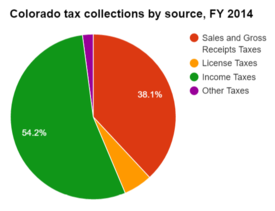 The table below lists 2014 tax collections by source as percentages of total collections. About 54.2 percent of Colorado's total state tax collections came from income taxes.[5]