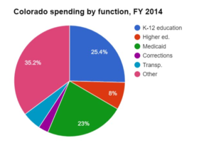State spending in Colorado can be further broken down by function (elementary and secondary education, public assistance, etc.). Fiscal year 2014 information is included in the table below (information from neighboring states is provided for additional context). Figures are rendered as percentages, indicating the share of the total budget spent per category.[2]