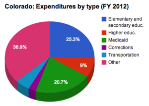 State expenditures in Colorado can be further broken down by function (elementary and secondary education, public assistance, etc.). Fiscal year 2012 data is included in the table below (information from neighboring states is provided for additional context). Figures are rendered as percentages, indicating the share of the total budget spent per category.
