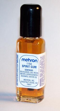 From Handwiki Spirit gum is an adhesive, made mostly of SD Alcohol 35-A (the solvent, or "spirit") and resin (the adhesive, or "gum") originally consisting of mastix, used primarily for affixing costume prosthetics such as wigs, merkins, or false facial hair. It has been manufactured since at least the 1870s, and has long been a standard tool in theatrical performances where prosthetic makeup or affixed costuming is used. It was mentioned in the earliest known published theatre makeup manual: "How to make-up; a practical guide for amateurs by Haresfoot and Rouge" in 1877.[1] At the end of the nineteenth century, spirit gum could be procured by performers at theatrical wig makers and it was removed with alcohol, cocoa butter or petroleum jelly.[2]