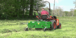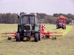 A hay rake is an agricultural rake used to collect cut hay or straw into windrows for later collection (e.g. by a baler or a loader wagon). It is also designed to fluff up the hay and turn it over so that it may dry. It is also used in the evening to protect the hay from morning dew. The next day a tedder is used to spread it again, so that the hay dries more quickly.