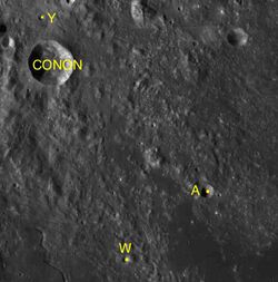 By convention these features are identified on lunar maps by placing the letter on the side of the crater midpoint that is closest to Conon.