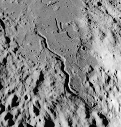To the south, in the Sinus Fidei, is a sinuous rille that follows a course to the south-southeast. This rille is designated Rima Conon, and is named after this crater.