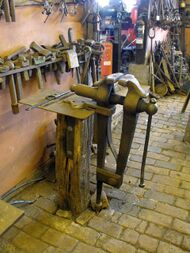 - Leg vise or post vise,[4] which is attached to a bench but also supported from the ground so as to be stable under very heavy use, as by an auto body repairman or blacksmith