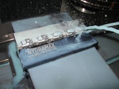 Aluminum soft jaw shown holding five parts at a time in a CNC milling machine