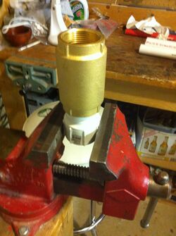 A pipe vise is used by a plumber to hold pipes for threading and cutting. There are two main styles, yoke and chain. The yoke uses a top-mounted screw to clamp the pipe between two fixed angled jaws at its base; the chain style secures the pipe by wrapping it within a chain designed to adjust to length by link, tightened by a cam lever.