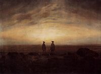 High levels of tephra in the atmosphere caused a haze to hang over the sky for several years after the eruption, and created rich red hues in sunsets. Paintings during the years before and after seem to confirm that these striking reds were not present before Mount Tambora's eruption,[40][41] and depict moodier, darker scenes, even in the light of both the sun and the moon. Caspar David Friedrich's The Monk by the Sea (ca. 1808–1810) and Two Men by the Sea (1817) indicate this shift of mood.[40]