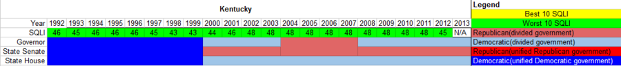 The chart below depicts the partisanship of the Kentucky state government and the state's SQLI ranking for the years studied. For the SQLI, the states were ranked from 1-50, with 1 being the best and 50 the worst. Kentucky has been in the bottom-10 of the SQLI ranking regardless of its Democratic trifecta or years under divided government. The state’s highest ranking came in 1998 and 1999 (43rd) under a Democratic trifecta, while the state’s lowest ranking came in between the years 2003 and 2011 (48th) under divided government. The state has never had a Republican trifecta.