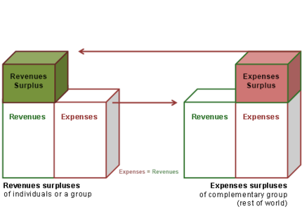 Revenue surpluses of a group are only possible if the complementary group enables an expense surplus. Economic relationships always are two-sided, because every expense comes up to a revenue and every debt to a claim. If an economic entity gains more than it spends, the complementary group must spend more than it gains: