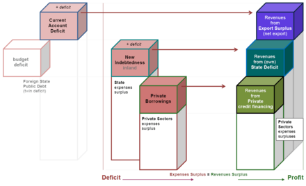 In 2002 Ewald Nowotny for instance explained: "Significant for economy politics thereby is the compulsory Balances Mechanics relationship, that a policy aiming at reducing budget deficits (funding consolidation) can only be successful when it succeeds in reducing the financial surplus of the private households (e.g. by higher private consumption) and/or in rising the debt willingness of companies (for instance, by investments) and/or in improving the trade balance (for example, by additional export)."[20]