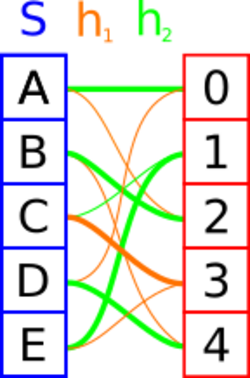 A retrieval data structure can be used to construct a perfect hash function: First insert the keys into a cuckoo hash table with [math]\displaystyle{ H=2^r }[/math] hash functions [math]\displaystyle{ h_i }[/math] and buckets of size 1. Then, for every key store the index of the hash function that lead to a key's insertion into the hash table in a [math]\displaystyle{ r }[/math]-bit retrieval data structure [math]\displaystyle{ D }[/math]. The perfect hash function is given by [math]\displaystyle{ h_{D(x)}(x) }[/math].[5]