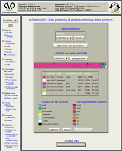 The client is booted over the network during the installation of the operating system. It is possible to start the client with a boot ROM on its network card, a boot disk or a boot CD. The client's hardware is detected and set up. The gathered hardware and partition information is sent to the m23 server. Afterwards, this information is shown in the m23 administration interface. Now the administrator has to choose how to partition and format the client. There are other settings, too, e.g. the distribution to be installed on the client.