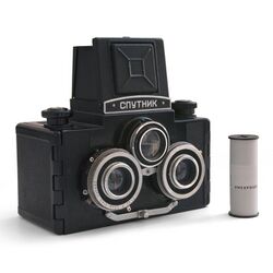 Sputnik stereo camera. The two lower lenses are used for the photograph, while the third lens is used for composition.