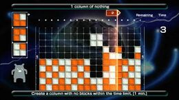 Lumines Live! is a puzzle game similar to its predecessor, Lumines. The objective of the game is to rotate, move, and drop colored blocks varying between two colors to form 2×2 squares of the same color.[1] A vertical line known as the Time Line sweeps over the playing field and will erase the colored squares, granting points to the player's overall score.[1] Deleting four or more squares will add a bonus multiplier to the player's overall score. Players lose the game when the blocks reach the top of the playing field.[2][3] Stages vary from thematic visual themes known as "Skins" that change the music, background, and sound effects.[2] There are seven game modes: Challenge mode, Puzzle, Time Attack, VS CPU, and Duel Mode.[1] In Challenge mode, players are tasked to survive as long as possible and gain the highest possible score. Puzzle mode tasks players to use the blocks to create specific shapes. Time Attack mode tasks players to clear as many squares as possible within an allotted time.[1] Time Attack mode also allows players to share a recording of their best playthrough. In VS CPU mode, players share the playing field with an AI opponent and must defeat them by clearing more squares than them, causing players to claim more of the playing field. In Duel Mode, players can compete with each other either locally or online. Unlike its predecessor, Lumines Live! also allows players to accumulate over one million points in a play session.[4]