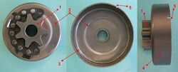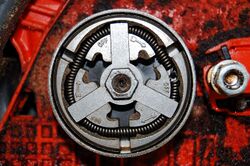 Typically, a centrifugal clutch and sprocket are used. The centrifugal clutch expands with increasing speed, engaging a drum. On this drum sits either a fixed sprocket or an exchangeable one. The clutch has three jobs: When the engine runs idle (typically 2500-2700 rpm) the chain does not move. When the clutch is engaged and the chain stops in the wood for another reason, it protects the engine. Most importantly, it protects the operator in case of a kickback. Here, the chain brake stops the drum, and the clutch releases immediately.