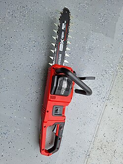 For most of the early 21st century petrol driven chainsaws remained the most common type, but they faced competition from cordless lithium battery powered chainsaws from the late 2010s onwards.[18] Although most cordless chainsaws are small and suitable only for hedge trimming and tree surgery,[19] Husqvarna and Stihl began manufacturing full size chainsaws for cutting logs during the early 2020s.[20] Battery powered chainsaws should eventually see increased market share in California due to state restrictions planned to take effect in 2024 on gas powered gardening equipment.[21][22]
