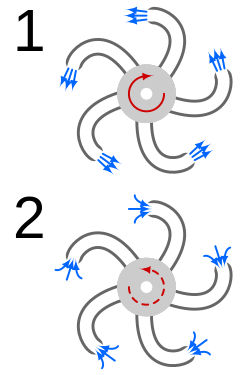 Differences in the regions over which internal and external forces act constitute a force-couple with different moment arms consistent with reverse rotation. ... the resulting flow-field asymmetry developed downstream from the sprinkler-arm bends supports the role of vortices in reverse sprinkler rotation by suggesting a mechanism for generating vortices in a consistent direction.[13]