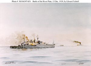 The German "pocket battleship", KMS Graf Spee, was an advanced design 16,200 ton design, heavily armed with (6×11 inch/280 mm, 8×5.9 inch/150 mm)[5] She had a long run of commerce raiding, but was eventually confronted by three British cruisers in December 1939: