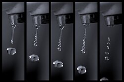 Because Earth's environment is relatively close to water's triple point, water exists on Earth as a solid, a liquid, and a gas.[3] It forms precipitation in the form of rain and aerosols in the form of fog. Clouds consist of suspended droplets of water and ice, its solid state. When finely divided, crystalline ice may precipitate in the form of snow. The gaseous state of water is steam or water vapor.