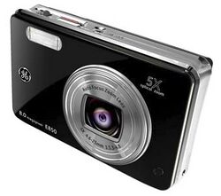 The intermediate level of the GE-branded camera models, the E series features larger screens and is powered by rechargeable lithium-ion batteries. Memory can be expanded up to 4 gigabytes with SD or SDHC memory cards.