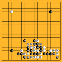 The pioneering European player Oskar Korschelt disliked kifus because nineteenth century kifus always used Chinese numerals, which are indeed difficult to read unless one is familiar with them. Numbering in that style continued until 1945, having been popular in the 1930s on the basis of nationalist feeling in Japan. (Hindu-Arabic numerals were also used.) In Japanese Go books, when unoccupied points of the board are mentioned in the commentary, they are usually labelled by hiragana (in iroha order) to this day.
