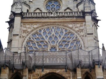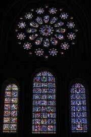 Important windows made in France during this period include the rose window on the west facade of Sainte-Chapelle (1485–98), which used paint on glass with exceptional realism and fantasy to depict the Apocalypse. the Church of Saint Severin in Paris is another example.[25] Rouen was an important center for making late Gothic glass; an exceptional collection of windows from this period is found at the Church of Saint-Maclou in Rouen.[27]