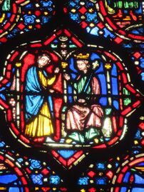 Unlike the windows of most Gothic cathedrals, where the windows were primarily devoted to the lives of the Saints and Apostles, the windows of Sainte-Chapelle were primarily devoted to the relics preserved in the chapel; fragments believed to be from the True Cross and the Crown of Thorns from the Crucifixion of Christ. The windows depicted the history of the Hebrew people, and finally connected the Biblical Kings with the reign of the window's patron, Louis IX. The King was depicted in the windows carrying the crown of Christ.[13]