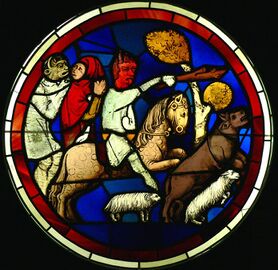 Devil kidnapping a woman, Sainte-Chapelle pane (mid-13th c.) (Now in Museum of Middle Ages, Paris)