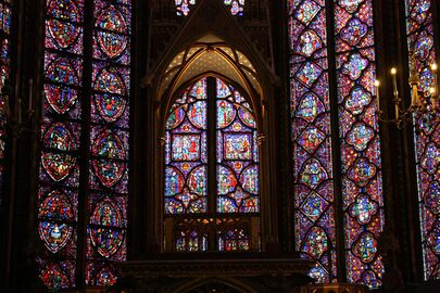 The most important and influential work in this style is the upper royal chapel of Sainte-Chapelle (1234–1244), built for Louis IX to display his recently acquired collection of sacred relics.[10] The single chapel contains 670 square meters of stained glass, not counting the later west rose window, and the walls, 20.4 meters high under the vault, appear entirely to be made of glass. This was made possible by moving the supports of the wall, clusters of nine colonettes, to the exterior. In addition, the windows were supported by two series of iron bars, at mid-height and at the summit. The iron support bars are concealed by the bars of the tracery. Other metal supports for the windows are hidden under the eaves of the roof.[11]