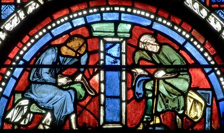 A few important examples of 12th-century windows are found at Chartres Cathedral on the inside of the western facade, in three lancet windows under the rose window. These windows survived a devastating fire in the Cathedral in 1194, and are considered some of the best examples of 12th-century work in France.[5] They introduced the famous Chartres blue, glass colored with Cobalt(II) oxide, which cooled and balanced the vivid reds and yellows of the windows. Each of the windows also contains a medallion which illustrates its donors; the butchers for the Miracle of the Virgin Window, the water-carriers for the Story of Mary Magdalene window. The cathedral also has an early Tree of Jessé window, illustrating the genealogy of Christ in the shape of a family tree imagined in a dream by the prophet Jesse.[5]