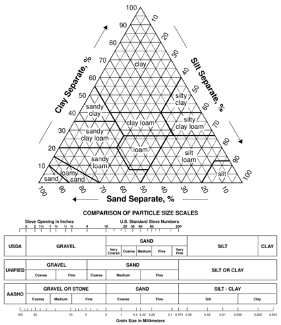 In the United States, twelve major soil texture classifications are defined by the United States Department of Agriculture.[1] The twelve classifications are sand, loamy sand, sandy loam, loam, silt loam, silt, sandy clay loam, clay loam, silty clay loam, sandy clay, silty clay, and clay.[5] Soil textures are classified by the fractions of each soil separate (sand, silt, and clay) present in a soil. Classifications are typically named for the primary constituent particle size or a combination of the most abundant particles sizes, e.g. "sandy clay" or "silty clay". A fourth term, loam, is used to describe equal properties of sand, silt, and clay in a soil sample, and lends to the naming of even more classifications, e.g. "clay loam" or "silt loam".