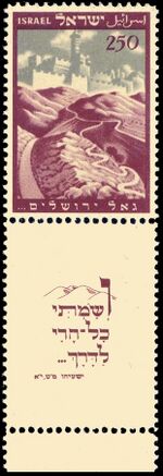 Inscription on the stamp "He has redeemed Jerusalem..." with inscription on tab: "And I will make all my mountains a way... , Isaiah 49:11". Jerusalem stamp - 250 mil.
