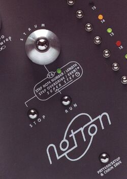 The Notron is a British-designed MIDI step sequencer used by Björk, Peter Gabriel, Howie B[1] and others.[2] Produced in two models, the Mark 1 was available between 1996 and 1998. The Mark 2 was a slim blue box produced until about 2001. About 100 Mark 1 units were sold and a similar amount of Mark 2s.The Notron was a step-time MIDI sequencer having four rows and up to 16 steps.[2] It was made to be used as a lap-top device for ease in live performances.[3] In 2006 the company released a software version of the Latronic Notron.[4]