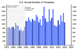 The reliable climatology of tornadoes is limited in geographic and temporal scope; only since 1976 in the United States and 2000 in Europe have thorough and accurate tornado statistics been logged.[57][58] However, some trends can be noted in tornadoes causing significant damage in the United States, as somewhat reliable statistics on damaging tornadoes exist as far back as 1880. The highest incidence of violent tornadoes seems to shift from the Southeastern United States to the southern Great Plains every few decades. Also, the 1980s seemed to be a period of unusually low tornado activity in the United States, and the number of multi-death tornadoes decreased every decade from the 1920s to the 1980s, suggesting a multi-decadal pattern of some sort.[59] Also more advanced weather warning and prediction has led to fewer tornado related deaths.
